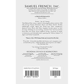 Edward AlbeeFull Length, Drama Characters: 2 male, 4 female Interior Set This Pulitzer Prize winner enjoyed a stunning Broadway revival in 1996 with George Gizzard, Rosemary Harris and Elaine Stritch. Wealthy middle-aged couple, Agnes and Tobias have their complacency shattered when Harry and Edna, longtime friends appear at their doorstep. Claiming an encroaching, nameless "fear" has forced them from their own home, these neighbors bring a firestorm of doubt, recrimination and ultimately solace, upsetting the "delicate balance" of Agnes and Tobias' household.Winner of the 1996 Drama Desk and Award, Best Revival. "Powerful...A beautiful play filled with humor and compassion, and touched with poetry...[with] the stature and eloquence of a classic."-New York Daily News "A brilliant play."-New York Post "An evening of theatrical fireworks."-The New York Times